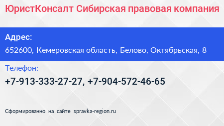 ЮристКонсалт, Сибирская правовая компания по адресу 652600, Кемеровская область, Белово, Октябрьская, 8 в дальнейшем Организация, размещена в следующих категориях: