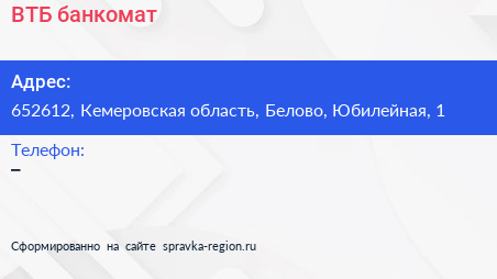 ВТБ, банкомат по адресу 652612, Кемеровская область, Белово, Юбилейная, 1 в дальнейшем Организация, размещена в следующих категориях: