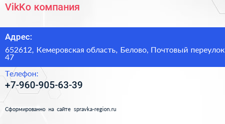 VikKo, компания по адресу 652612, Кемеровская область, Белово, Почтовый переулок, 47 в дальнейшем Организация, размещена в следующих категориях: