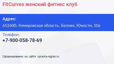 FitCurves, женский фитнес-клуб по адресу 652600, Кемеровская область, Белово, Юности, 10а в дальнейшем Организация, размещена в следующих категориях: