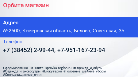 Орбита, магазин по адресу 652600, Кемеровская область, Белово, Советская, 36 в дальнейшем Организация, размещена в следующих категориях: