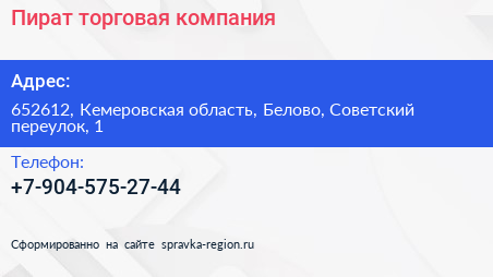 Пират, торговая компания по адресу 652612, Кемеровская область, Белово, Советский переулок, 1 в дальнейшем Организация, размещена в следующих категориях: