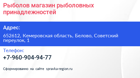Рыболов, магазин рыболовных принадлежностей по адресу 652612, Кемеровская область, Белово, Советский переулок, 1 в дальнейшем Организация, размещена в следующих категориях: