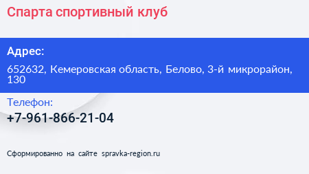 Спарта, спортивный клуб по адресу 652632, Кемеровская область, Белово, 3-й микрорайон, 130 в дальнейшем Организация, размещена в следующих категориях: