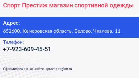 Спорт Престиж, магазин спортивной одежды по адресу 652600, Кемеровская область, Белово, Чкалова, 11 в дальнейшем Организация, размещена в следующих категориях: