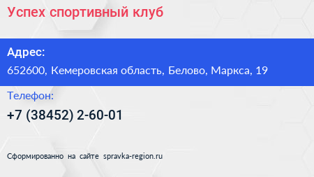 Успех, спортивный клуб по адресу 652600, Кемеровская область, Белово, Маркса, 19 в дальнейшем Организация, размещена в следующих категориях: