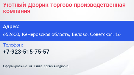 Уютный Дворик, торгово-производственная компания по адресу 652600, Кемеровская область, Белово, Советская, 16 в дальнейшем Организация, размещена в следующих категориях: