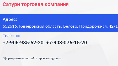 Сатурн, торговая компания по адресу 652616, Кемеровская область, Белово, Придорожная, 42/1 в дальнейшем Организация, размещена в следующих категориях: