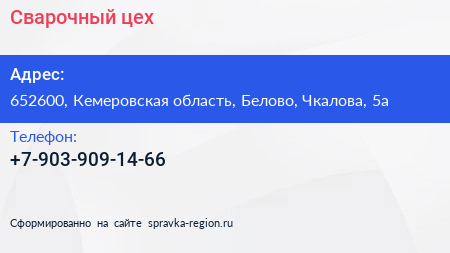 Сварочный цех по адресу 652600, Кемеровская область, Белово, Чкалова, 5а в дальнейшем Организация, размещена в следующих категориях:
