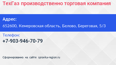 ТехГаз, производственно-торговая компания по адресу 652600, Кемеровская область, Белово, Береговая, 5/3 в дальнейшем Организация, размещена в следующих категориях: