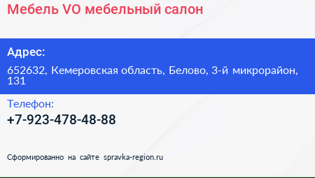 Мебель-VO, мебельный салон по адресу 652632, Кемеровская область, Белово, 3-й микрорайон, 131 в дальнейшем Организация, размещена в следующих категориях: