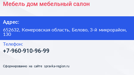 Мебель дом, мебельный салон по адресу 652632, Кемеровская область, Белово, 3-й микрорайон, 130 в дальнейшем Организация, размещена в следующих категориях: