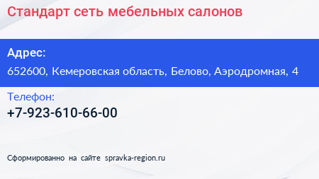 Стандарт, сеть мебельных салонов по адресу 652600, Кемеровская область, Белово, Аэродромная, 4 в дальнейшем Организация, размещена в следующих категориях: