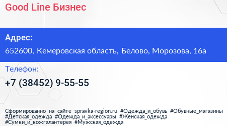 Good Line Бизнес по адресу 652600, Кемеровская область, Белово, Морозова, 16а в дальнейшем Организация, размещена в следующих категориях:
