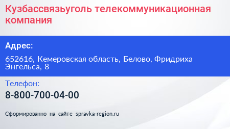 Кузбассвязьуголь, телекоммуникационная компания по адресу 652616, Кемеровская область, Белово, Фридриха Энгельса, 8 в дальнейшем Организация, размещена в следующих категориях:
