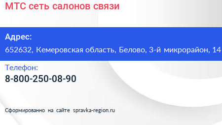 МТС, сеть салонов связи по адресу 652632, Кемеровская область, Белово, 3-й микрорайон, 14 в дальнейшем Организация, размещена в следующих категориях: