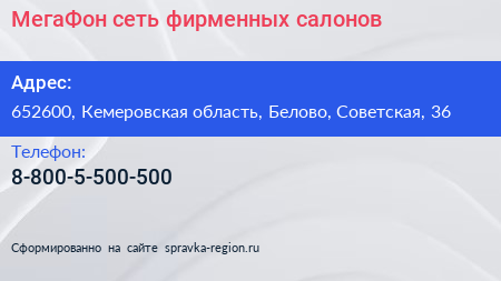 МегаФон, сеть фирменных салонов по адресу 652600, Кемеровская область, Белово, Советская, 36 в дальнейшем Организация, размещена в следующих категориях: