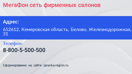 МегаФон, сеть фирменных салонов по адресу 652612, Кемеровская область, Белово, Железнодорожная, 31 в дальнейшем Организация, размещена в следующих категориях: