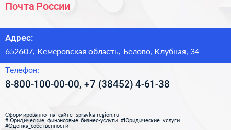 Почта России по адресу 652607, Кемеровская область, Белово, Клубная, 34 в дальнейшем Организация, размещена в следующих категориях: