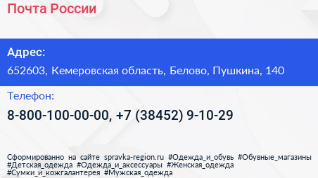 Почта России по адресу 652603, Кемеровская область, Белово, Пушкина, 140 в дальнейшем Организация, размещена в следующих категориях: