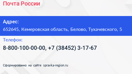 Почта России по адресу 652645, Кемеровская область, Белово, Тухачевского, 5 в дальнейшем Организация, размещена в следующих категориях: