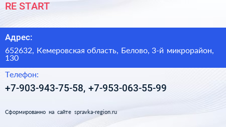 RE-START по адресу 652632, Кемеровская область, Белово, 3-й микрорайон, 130 в дальнейшем Организация, размещена в следующих категориях: