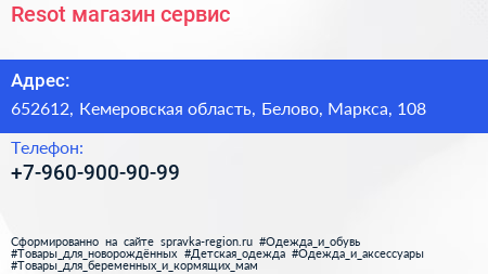 Resot, магазин-сервис по адресу 652612, Кемеровская область, Белово, Маркса, 108 в дальнейшем Организация, размещена в следующих категориях: