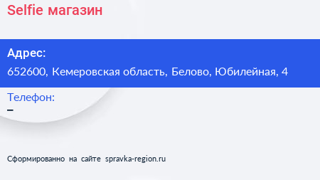 Selfie, магазин по адресу 652600, Кемеровская область, Белово, Юбилейная, 4 в дальнейшем Организация, размещена в следующих категориях: