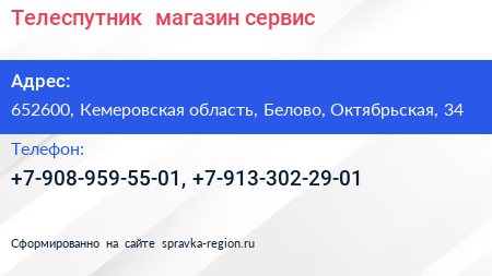 Телеспутник+, магазин-сервис по адресу 652600, Кемеровская область, Белово, Октябрьская, 34 в дальнейшем Организация, размещена в следующих категориях: