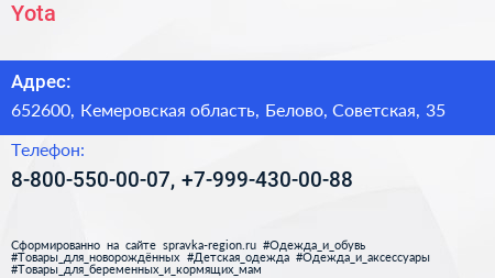 Yota по адресу 652600, Кемеровская область, Белово, Советская, 35 в дальнейшем Организация, размещена в следующих категориях: