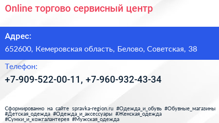 Online, торгово-сервисный центр по адресу 652600, Кемеровская область, Белово, Советская, 38 в дальнейшем Организация, размещена в следующих категориях: