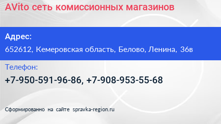 AVito, сеть комиссионных магазинов по адресу 652612, Кемеровская область, Белово, Ленина, 36в в дальнейшем Организация, размещена в следующих категориях: