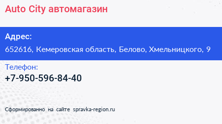 Auto-City, автомагазин по адресу 652616, Кемеровская область, Белово, Хмельницкого, 9 в дальнейшем Организация, размещена в следующих категориях: