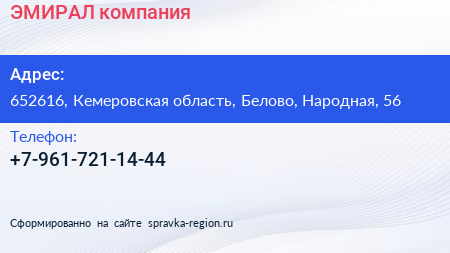 ЭМИРАЛ, компания по адресу 652616, Кемеровская область, Белово, Народная, 56 в дальнейшем Организация, размещена в следующих категориях:
