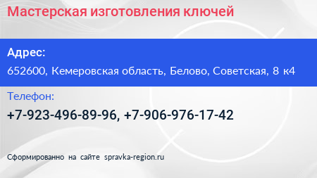Мастерская изготовления ключей по адресу 652600, Кемеровская область, Белово, Советская, 8 к4 в дальнейшем Организация, размещена в следующих категориях: