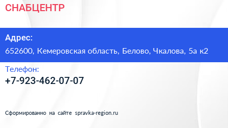 СНАБЦЕНТР по адресу 652600, Кемеровская область, Белово, Чкалова, 5а к2 в дальнейшем Организация, размещена в следующих категориях: