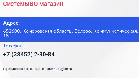СистемыВО, магазин по адресу 652600, Кемеровская область, Белово, Коммунистическая, 18 в дальнейшем Организация, размещена в следующих категориях: