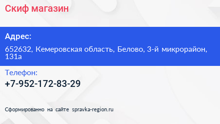 Скиф, магазин по адресу 652632, Кемеровская область, Белово, 3-й микрорайон, 131а в дальнейшем Организация, размещена в следующих категориях: