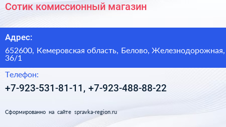 Сотик, комиссионный магазин по адресу 652600, Кемеровская область, Белово, Железнодорожная, 36/1 в дальнейшем Организация, размещена в следующих категориях: