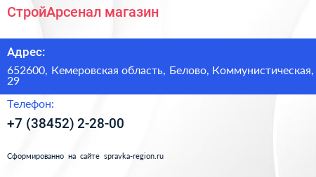 СтройАрсенал, магазин по адресу 652600, Кемеровская область, Белово, Коммунистическая, 29 в дальнейшем Организация, размещена в следующих категориях: