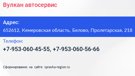Вулкан, автосервис по адресу 652612, Кемеровская область, Белово, Пролетарская, 218 в дальнейшем Организация, размещена в следующих категориях: