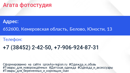 Агата, фотостудия по адресу 652600, Кемеровская область, Белово, Юности, 13 в дальнейшем Организация, размещена в следующих категориях: