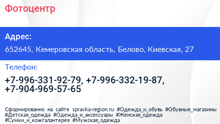 Фотоцентр по адресу 652645, Кемеровская область, Белово, Киевская, 27 в дальнейшем Организация, размещена в следующих категориях: