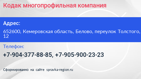 Кодак, многопрофильная компания по адресу 652600, Кемеровская область, Белово, переулок Толстого, 12 в дальнейшем Организация, размещена в следующих категориях: