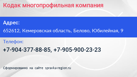 Кодак, многопрофильная компания по адресу 652612, Кемеровская область, Белово, Юбилейная, 9 в дальнейшем Организация, размещена в следующих категориях:
