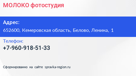 МОЛОКО, фотостудия по адресу 652600, Кемеровская область, Белово, Ленина, 1 в дальнейшем Организация, размещена в следующих категориях: