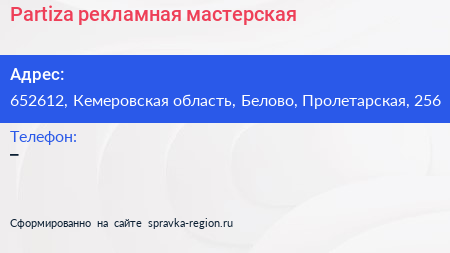 Partiza, рекламная мастерская по адресу 652612, Кемеровская область, Белово, Пролетарская, 256 в дальнейшем Организация, размещена в следующих категориях: