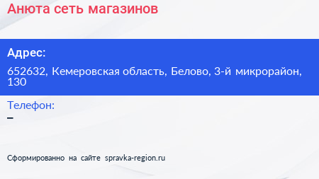 Анюта, сеть магазинов по адресу 652632, Кемеровская область, Белово, 3-й микрорайон, 130 в дальнейшем Организация, размещена в следующих категориях: