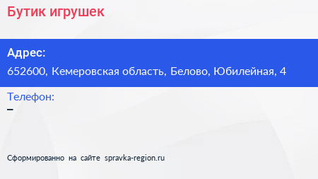 Бутик игрушек по адресу 652600, Кемеровская область, Белово, Юбилейная, 4 в дальнейшем Организация, размещена в следующих категориях: