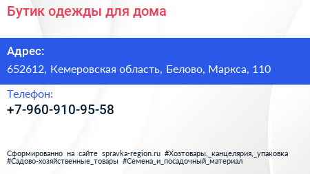 Бутик одежды для дома по адресу 652612, Кемеровская область, Белово, Маркса, 110 в дальнейшем Организация, размещена в следующих категориях: